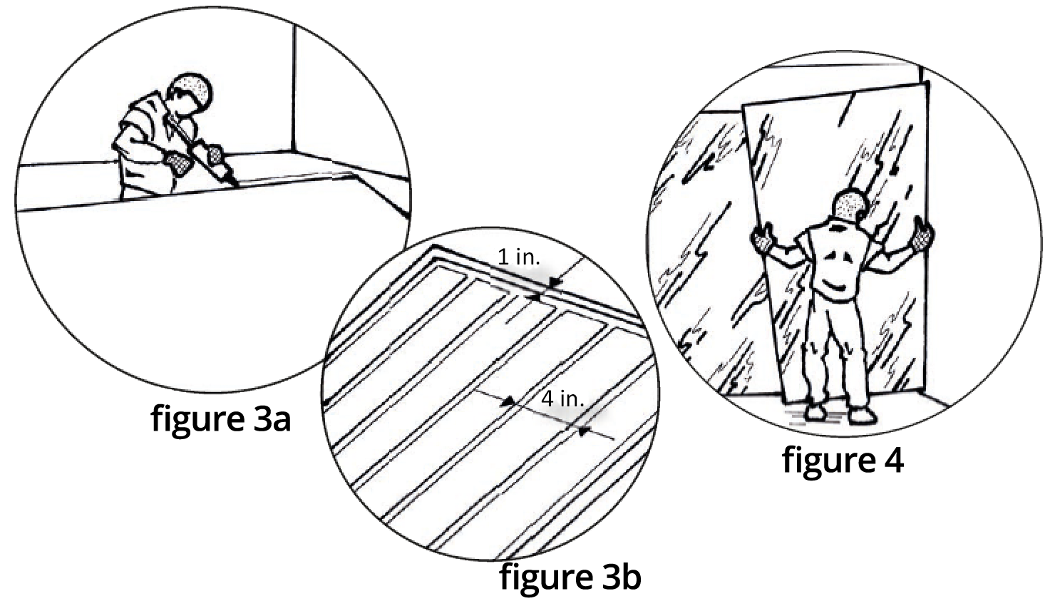 - The adhesive should be placed around the perimeter of the panel on all four sides at about 1 inch from the edge. Then apply vertical beads up and down the length of the panel at about 4 inches apart. (figure 3b)